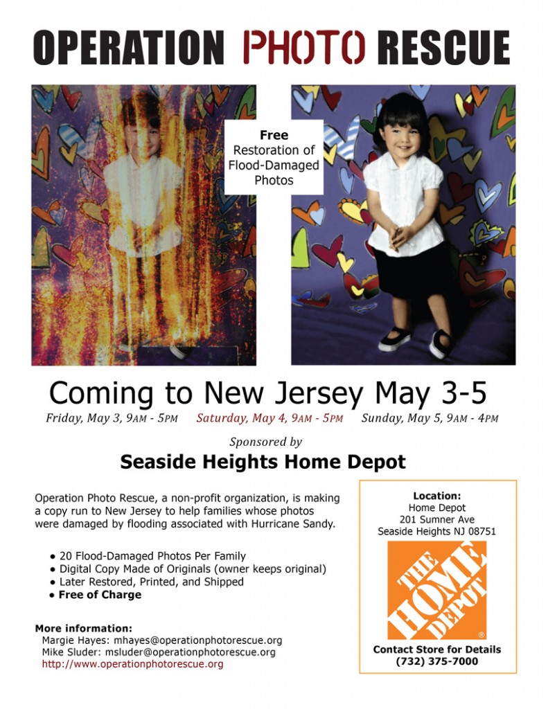 Operation Photo Rescue (OPR) will be coming to Seaside Height, NJ on May 3-5 to help families with photos damaged by Hurricane Sandy. For instructions on the care of damage photos, please reference this Page.