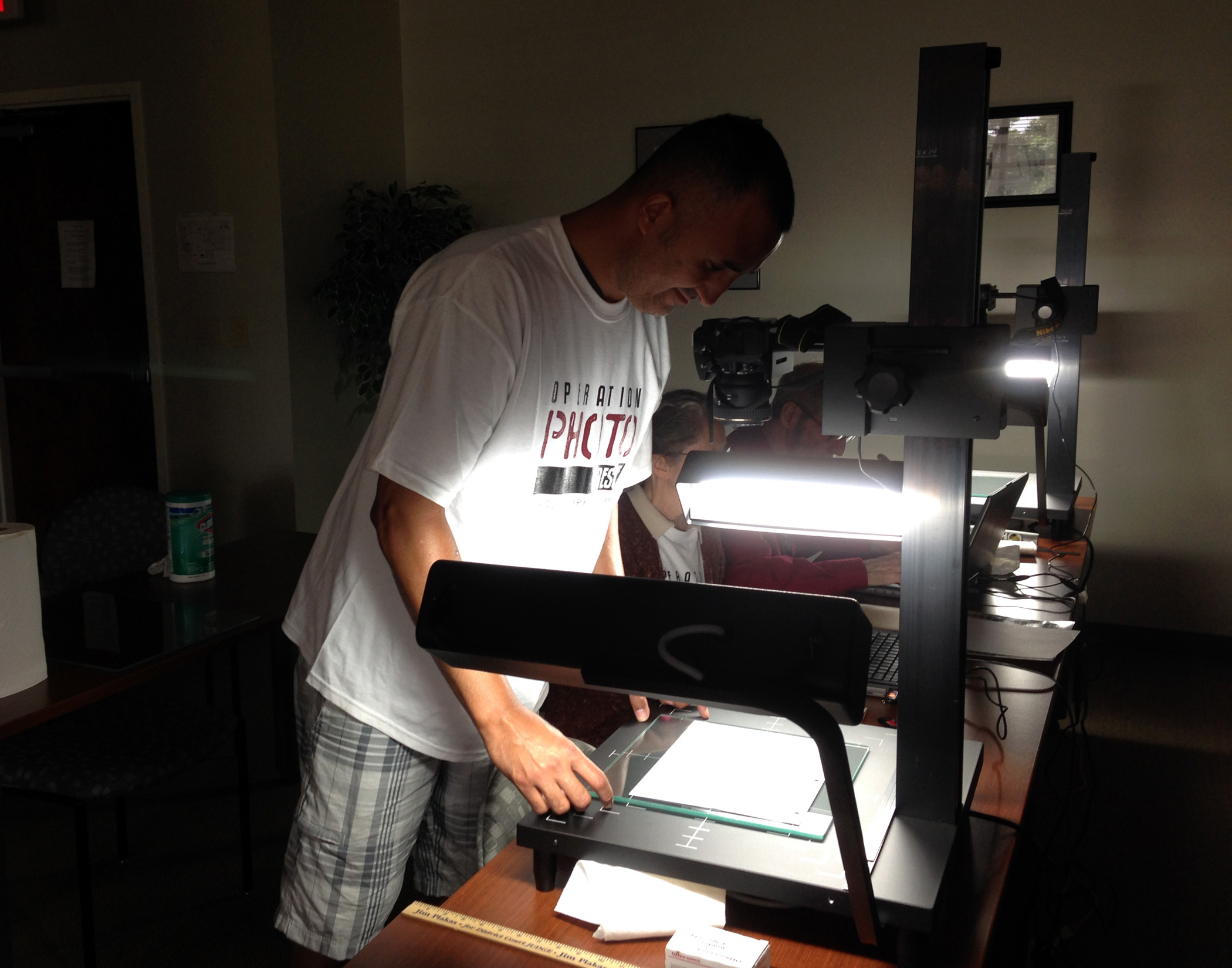 Omar Forty, photography student at Pensacola State College, getting the chance to run the copy stand with Mike and Pat Sluder. Other students helping were: Diane Rutledge, Paula Turner, Erin Amis, and adjunct teacher Jay Flynn.